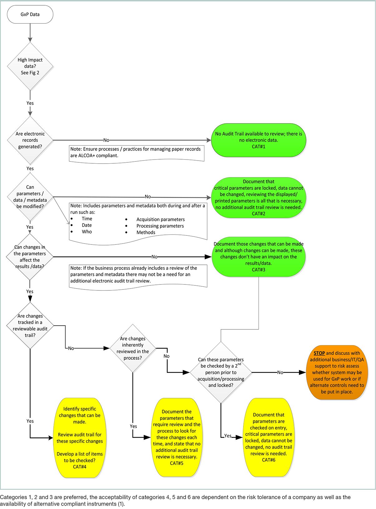 A decision tree has been developed (Figure 1) where data types were categorized and the need for audit trail review considered. This serves as a risk assessment that can be used to determine the need for procedural controls, and the controls should be documented within the qualification package for new equipment or in change management system for equipment updates. A risk assessment, for instance the one described in Assessing Data Integrity Risks in an R&D Environment (7), may be used to define data integrity elements for a system where audit trail review is the chosen mitigation. Figure 1 is specific to ATR and does not include data review. For GLP, data review and ATR need to happen at the same time, for GMP there may be opportunity to separate and streamline some activities with a documented risk-based approach.