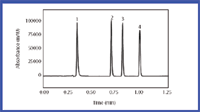 Figure 3: Ultrafast liquid chromatography (UFLC) chromatogram of xanthine derivatives (10 μg/mL): xanthine (1), theobromine (2), theophylline (3), caffeine (4). Instrument: Shimadzu Prominence UFLC. Column: Shim-pack XR-ODS (3.0 mmI.D. à 50 mmL, 2.2 μm); Mobile Phase: 20 mM (sodium) phosphate buffer (pH 2.6) for A and acetonitrile for B (70/30), B concentration 10% initial to 85% at 1.2 min.