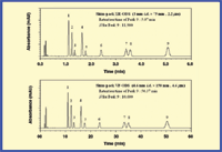 High-speed columns. The first part of this article dealt with columns, and many examples of fast analyses are available in the literature. Figure 2 shows a comparison between a typical isocratic separation performed on a 5-B5m particle and a mid-size (2.2-μm) particle. Figure 2 shows that the run time was shortened by a factor of 10 with no loss in resolution. Mid-size silica gel-based material reduces column-flow resistance compared with that of a sub-2 μm particle column, thereby allowing high-speed analysis with conventional HPLC systems. Since these HPLC columns achieve a good balance between separation efficiency and pressure, resolution performance is maintained as in a general-purpose column (4.6 mmi.d. × 150 mm, 5 μm), and analysis time is greatly shortened.