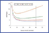 H is the HETP (column length required to obtain one theoretical plate—the smaller the H value, the greater the efficiency), A is eddy diffusion, dP is the packing-particle diameter, B is longitudinal diffusion, v is the mobile-phase linear velocity, and C is coefficient of mass transfer. The usefulness of smaller packing material with a microsphere-packed column for performing high-speed separation is attributed to the column's efficiency at high flow rates. This effect is demonstrated by the van Deemter curves for a compound that is run on a series of HPLC columns packed with particles of various sizes. As shown in Figure 1, the HETP remains small over a wider flow-rate range if smaller particle-size packing material is used.