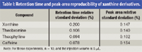 Table I: Retention time and peak-area reproducibility of xanthine derivatives.