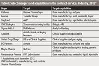 PharmSource has counted at least 20 acquisitions of CMC service providers in 2012 through the end of November 2012 (see Table I). Some of the larger and more significant deals are listed in the accompanying table. There seem to be a wide variety of underlying drivers for the acquisition activity, but several really stand out.