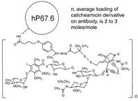 Wyeth's (Madison, NJ) Mylotarg is the only ADC approved by the US Food and Drug Administration. The drug was approved in 2000. Mylotarg consists of a recombinant humanized IgG4 kappa antibody conjugated with a cytotoxic antitumor antibiotic, calicheamicin, isolated from fermentation of a bacterium, Micromonospora echinospora subspecies calichensis (see Figure 1). The antibody portion of Mylotarg binds specifically to the CD33 antigen, a sialic acid-dependent adhesion protein found on the surface of leukemic blasts and immature normal cells of myelomonocytic lineage, but not on normal hematopoietic stem cells. The anti-CD33 hP67.6 antibody is produced by mammalian cell suspension culture using a myeloma NS0 cell line and is purified under conditions which remove or inactivate viruses. Three separate and independent steps in the hP67.6 antibody purification process achieves retrovirus inactivation and removal. These include low pH treatment, diethylaminoethyl (DEAE)-"Sepharose" chromatography, and viral filtration. Mylotarg's amino-acid sequences are 98.3% of human origin. The constant and framework regions contain human sequences. The complementarity-determining regions are derived from a murine antibody (p67.6) that binds CD33. This antibody is linked to N-acetyl-gamma calicheamicin via a bifunctional linker. Gemtuzumab ozogamicin has approximately 50% of the antibody loaded with four to six moles calicheamicin per mole of antibody. The remaining 50% of the antibody is not linked to the calicheamicin derivative (2).