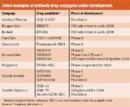 ADCs are monoclonal antibodies that link highly potent cyotoxics to the antibody, which delivers and releases the drug inside the tumor cell. A key component of Seattle Genetics's ADC technology is the linker that attaches the drug to the monoclonal antibody until internalized within the target cell where the drug is released. The company uses auristatin derivatives, which are synthetically produced and readily scaleable (1).
