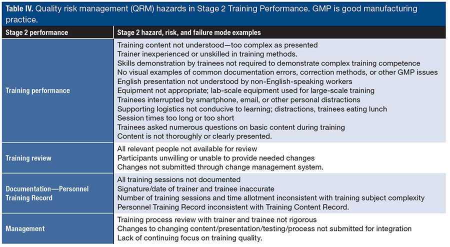 Stage 1 hazards. Stage 1 hazards are identified during the design and development of the training content by the training author. Hazards are identified concurrently with the ‘what’ and ‘why’ of training; authors address ‘what might go wrong’ along with the what and why in subject matter. Addressing potential hazards within training leads to more effective content, presentation, and testing. Design personnel must anticipate potential problems during training design. Illustrations, videos, checklists, and other aids addressing problems should be incorporated into training design. Trainers must verbally emphasize critical content in their training presentation. Testing should emphasize questions on critical content. Addressing training problems through different types of learning (e.g., visual, auditory, reading/writing, kinesthetic, etc.) is recommended; employees learn in different ways. The greater the anticipated risk to product, process, or organization, the greater the potential problems, and the greater the effort that is required in training—a principle of ICH QRM. Table III provides examples of stage 1 hazards based on experiences and observations.