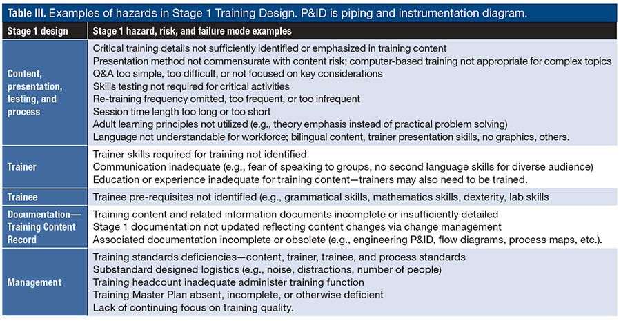Table III. Examples of hazards in Stage 1 Training Design. P&ID is piping and instrumentation diagram.
