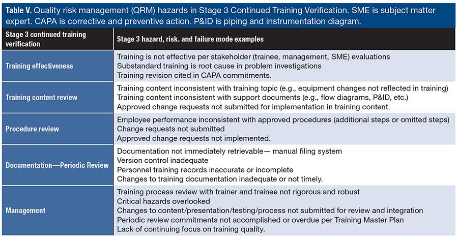 Table V. Quality risk management (QRM) hazards in Stage 3 Continued Training Verification. SME is subject matter expert. CAPA is corrective and preventive action. P&ID is piping and instrumentation diagram.