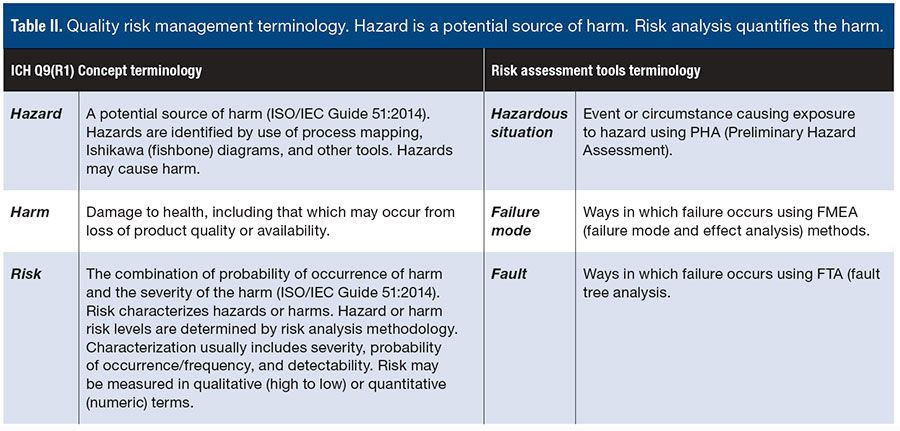 Table II. Quality risk management terminology. Hazard is a potential source of harm. Risk analysis quantifies the harm.