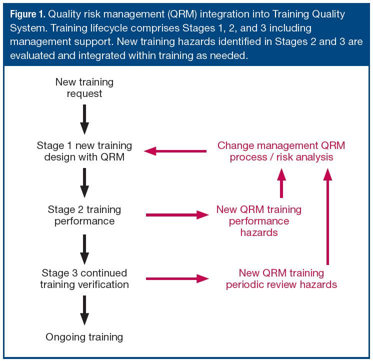 FIGURE IS COURTESY OF THE AUTHOR. Figure 1. Quality risk management (QRM) integration into Training Quality System. Training lifecycle comprises Stages 1, 2, and 3 including management support. New training hazards identified in Stages 2 and 3 are evaluated and integrated within training as needed.