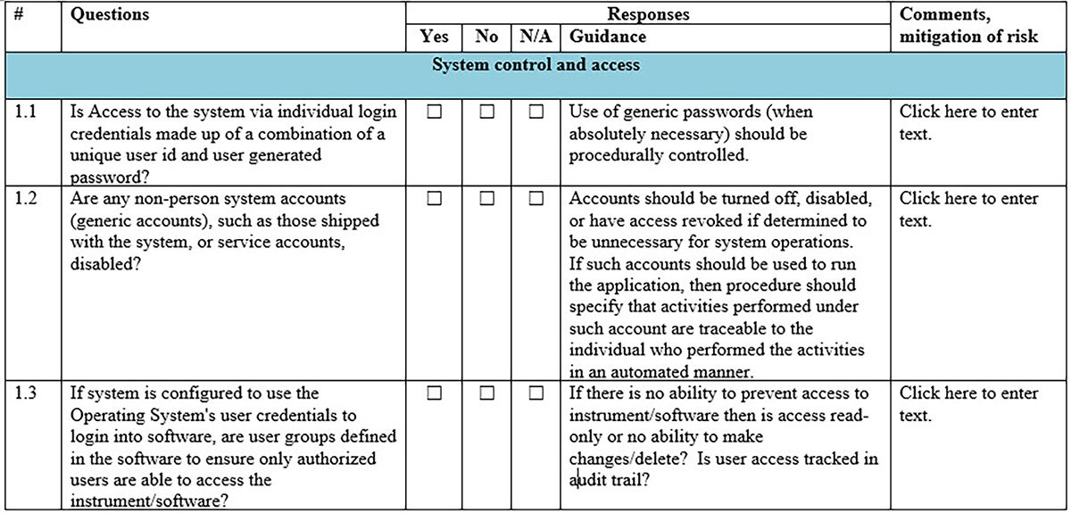 Questions. The first column contains a list of data-integrity requirements, each phrased as a question for which “yes” is the desired response. Options include yes, no, and not applicable (NA). These questions are designed to prompt a thorough investigation of the system at hand. As mentioned, the questions are phrased such that the desired response is “yes.” It is important to note that the assessment should be performed against the system (including the hardware, software, and any governing procedures) as it currently exists. If the system does not meet the expectation described in the question, a response of “no” should be selected.