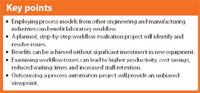 To date, scientists have been reluctant to exploit these available process models. However, the laboratory industry can benefit from employing the long-standing practices of productivity improvement and process automation employed by innovative process engineering companies. Laboratory workflow can be improved by exploiting the available process models from the manufacturing environment (for example, lean manufacturing or Kanban practices).