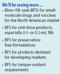 BFS container sizes extend from 0.1 to 10 L, although no single machine is capable of running this entire range. "BFS is especially well suited for small unit doses," says Kram, noting that it's impossible to buy a glass vial in a size smaller than 3 mL, and that prefilled syringes cost more than BFS containers.