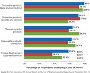 When asked about average budget changes from 2009–2012, those surveyed reported the highest budget increases were for new technologies to improve efficiencies and costs for downstream production (an average 6.4% increase) and for upstream production (an average 6.0% increase). For new products, the largest portion of respondents cited disposable bags and connectors (40.0%), followed by probes and sensors, (36.1%), chromatography products (32.2%), bioreactors (31.7%), and purification products (28.9%) (see Figure 1). Much of the interest in improved sensors, bioreactor, purification, and other equipment involves single-use applications. Only 10% of respondents wanted new stainless-steel equipment. In services, upstream process- development services topped the list.