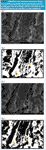 Figure 7 SEMs (first line) and black and white images of the SEMs (second line) of the same location at the breaking surface of a Gelcarin GP-911 NF tablet at 40% RH (ESEM); (a) 30 min and (b) 12 h after tabletting.