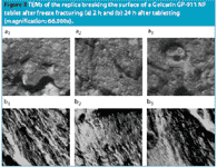 The result proves that following tabletting, changes in the material took place that caused the increase in density. To analyse the fibre structure more precisely, the breaking surface of Gel 911 tablets were analysed by transmission electron microscopy (TEM) after freeze fracturing (Figure 8). After 24 h (Figure 8[b]) stripes were visible that could not be detected 2 h (Figure 8[a]) after tabletting. A mechanical activation occurred that caused changes in the fibre structure and lead to the tablets shrinking. This mechanical activation can contribute to bonding.