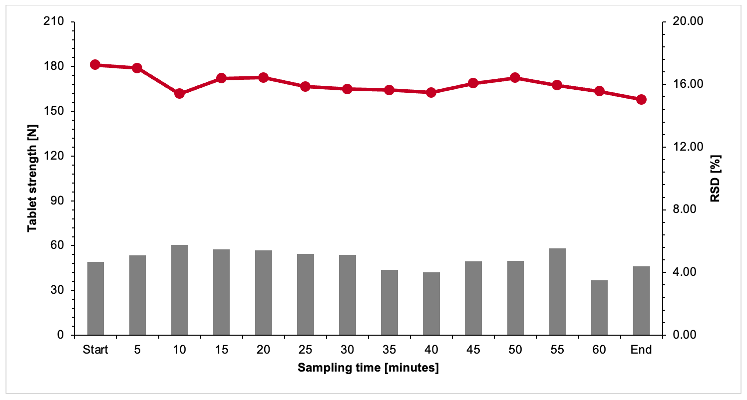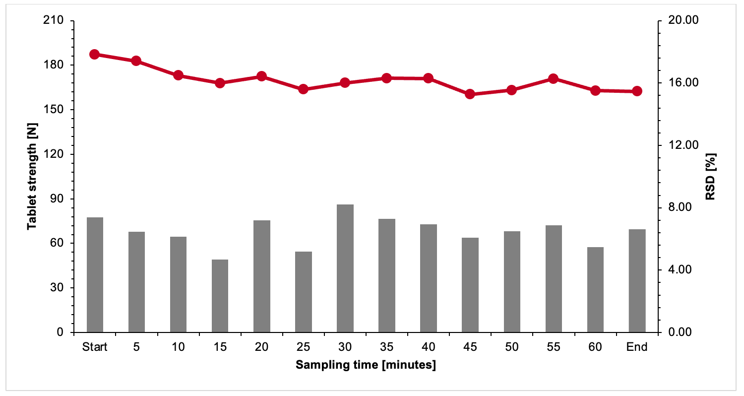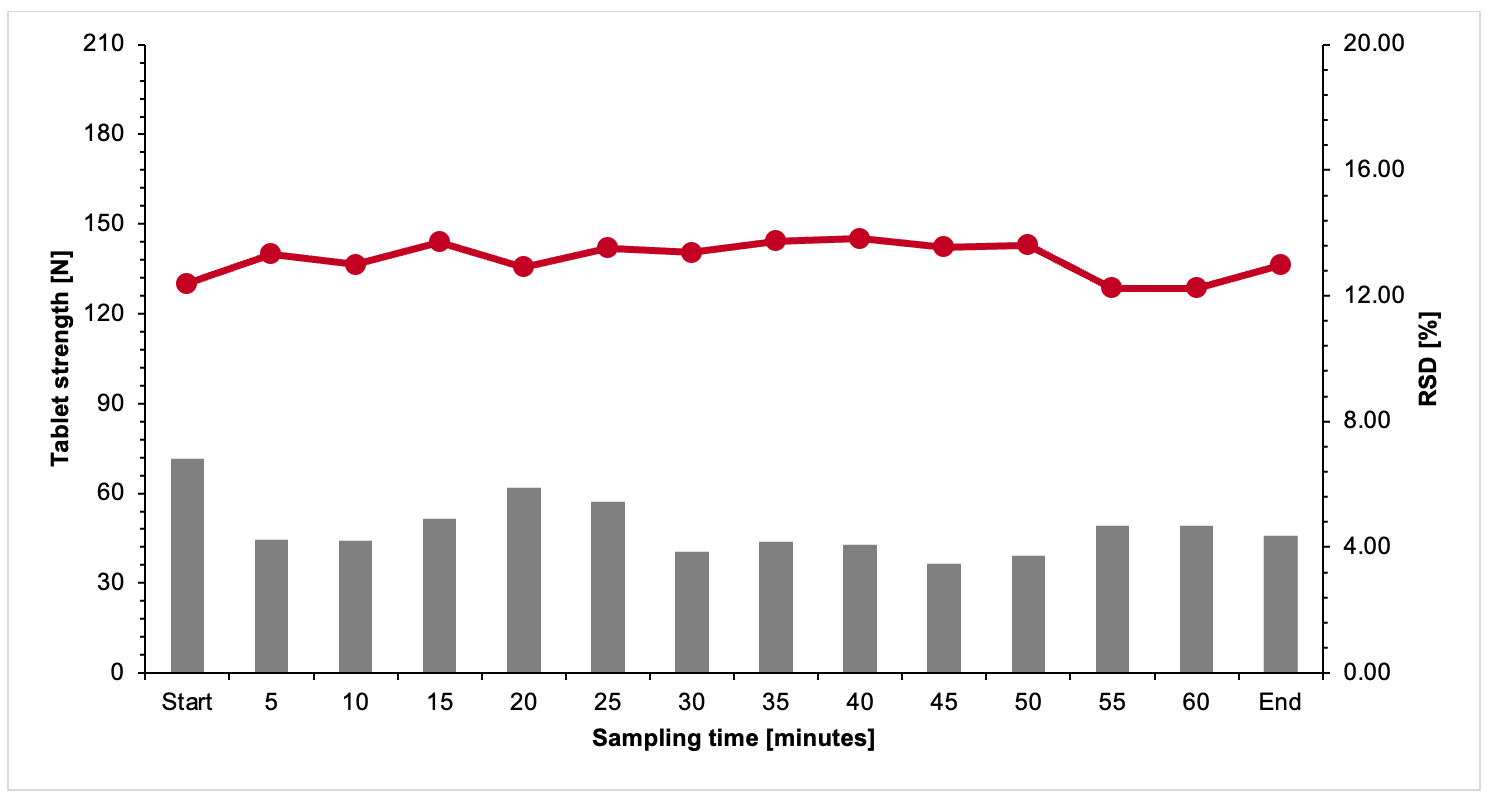 Figure 7. Tablet strength trend and RSD during 1 hour of production at full nominal tablet press speed.