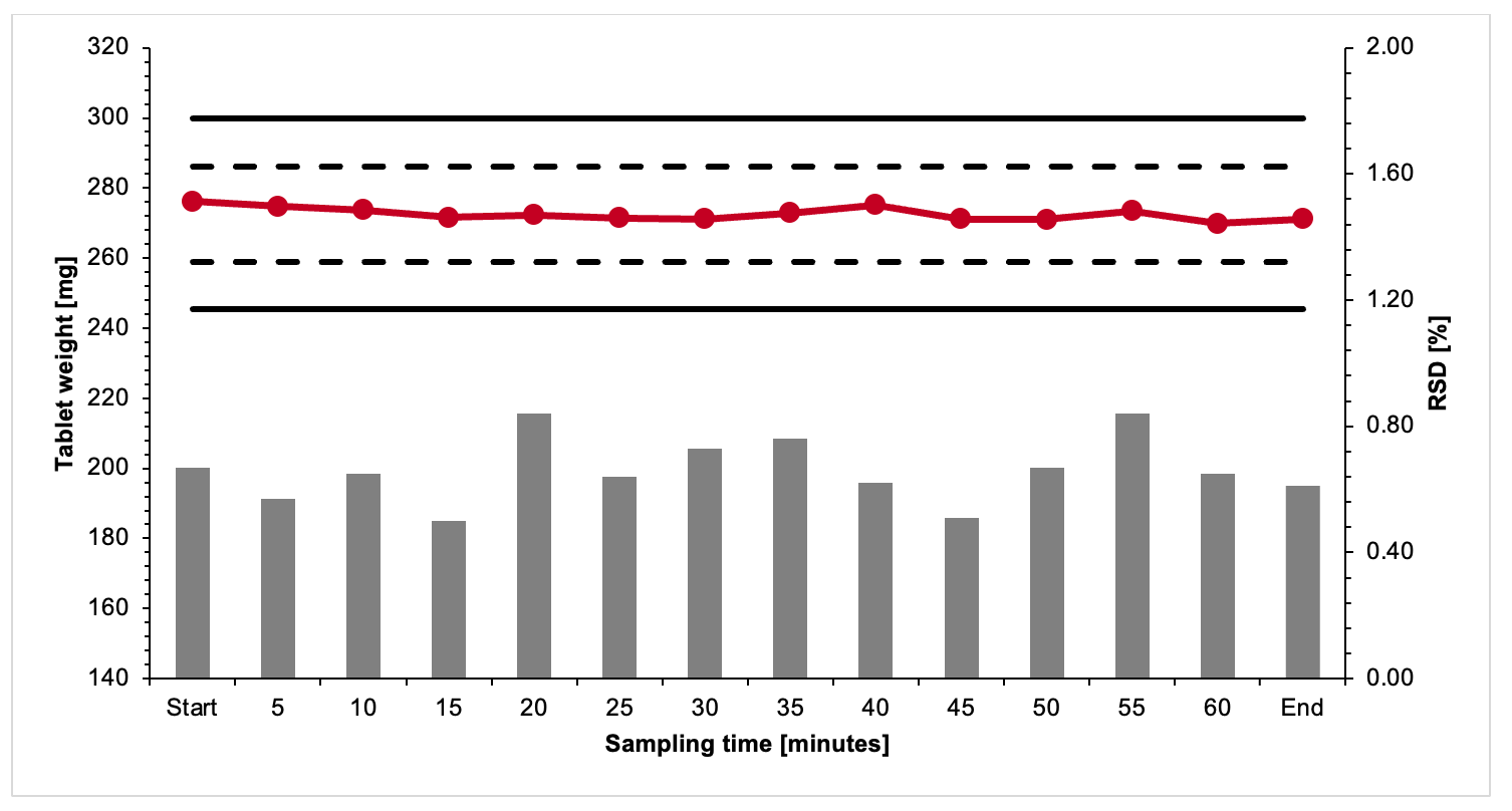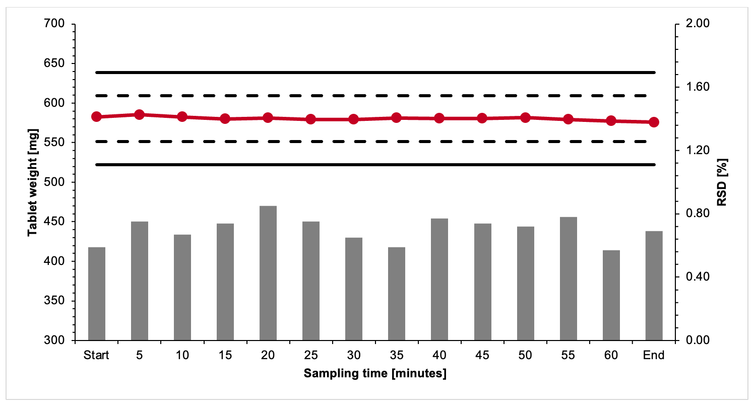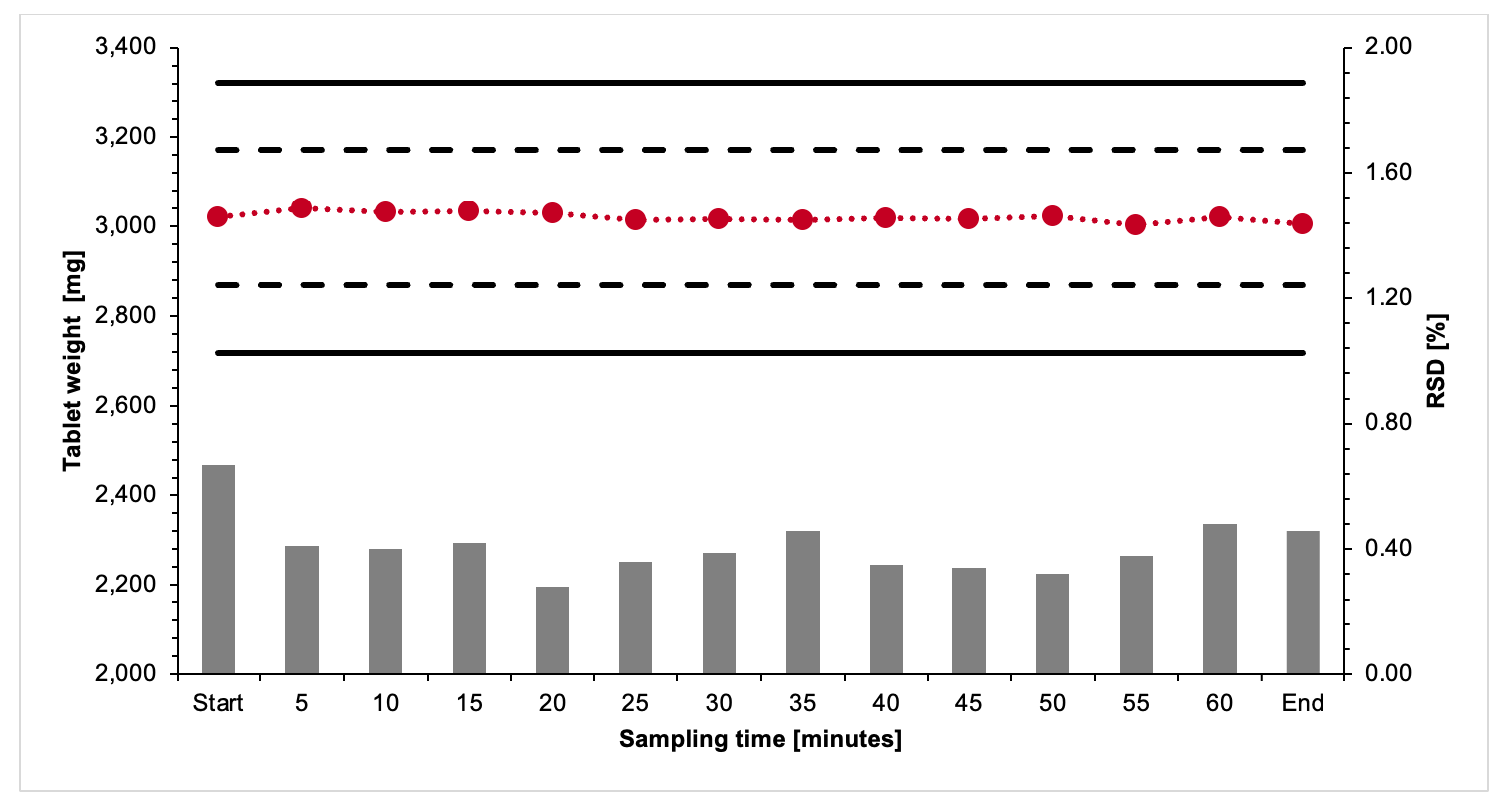 Figure 6. Weight trend and RSD during 1 hour of production at full nominal tablet press speed.