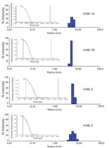 CLICK FIGURE TO ENLARGE Figure 1: The autocorrelation functions and regularization histograms of monoclonal antibody (mAb) 1a, mAb1b (IgG1) vs. mAb 2 and mAb 3 (IgG2).