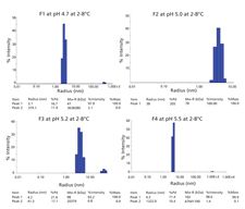 CLICK FIGURE TO ENLARGE Figure 4: Dynamic light scattering histograms of Rh for four monoclonal antibody (mAb) formulations at different pH values.