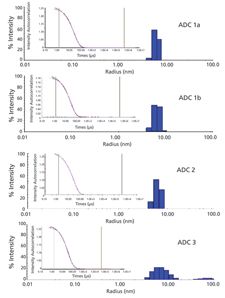 CLICK FIGURE TO ENLARGE Figure 2: The autocorrelation functions and regularization histograms of antibody-drug conjugate (ADC) ADC1a, ADC1b (IgG1) vs. ADC3 and ADC4 (IgG2).