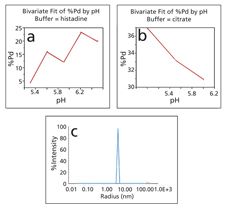 CLICK FIGURE TO ENLARGE Figure 3: Formulation screening: % polydispersity (Pd) of histidine formulations (a) vs. citrate formulations (b) and the histogram of the F5 formulation (c).