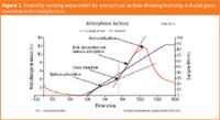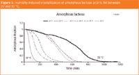 If experiments similar to that shown in Figure 5 are performed at different temperature or humidity conditions, then the crystallization kinetic mechanism can be elucidated, and crystallization behaviour can be predicted with a wider range of vapour concentration and temperature conditions. Figure 5 shows the crystallization behaviour for an amorphous lactose sample at 51% RH and different temperatures. The scale has been normalized such that time equal to zero is set to the point at which crystallization begins. Moreover, the y-axis is normalized to fraction crystallized (1 = completely amorphous; 0 = completely crystalline). When processed with a mechanistic modelling package, the data in Figure 4 resulted in a mechanism with two competing, two-step reactions. Complete details on the crystallization mechanism can be found in the literature.13 Once the mechanism is determined, it is possible to predict the crystallization behaviour of the amorphous phase with a wide range of storage, processing and packaging conditions. This approach can also be used to study other solid-state transitions, such as dehydration, hydration, or solvation.16–18