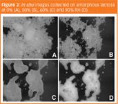 Figure 2 displays a humidity ramping experiment for an amorphous lactose sample. Below the glass transition, water sorption will be dominated by surface adsorption. Above the glass transition, water sorption is dominated by bulk absorption. The transition point between these two regimes is taken as the vapour-induced glass transition. In Figure 2, this occurs at approximately 30% RH. This technique has been used previously on different materials with results similar to those found by DSC.13 As the humidity is increased and water vapour further plasticizes the sample, some low molecular weight materials may relax to the crystalline state. This is observed in Figure 2 by the sharp mass loss at approximately 60% RH. Again, this correlates well to other vapour studies on amorphous lactose.13 The physical changes inferred from the gravimetric data can be further supported by in situ microscopic images collected during the experiment. Figure 3 shows 100x images of amorphous lactose taken at 0% (A), 50% (B), 60% (C) and 90% RH (D). By 50% RH, the sample has changed to the glassy form because the humidity-induced glass transition has been reached. By 60% RH, the sample begins to crystallize and at 90% RH crystallization of amorphous lactose is evident by an increase in the opacity of the image. When combined with the change in mass results in Figure 2, the images shown in Figure 3 identify different humidity-induced phase changes.
