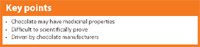 Chocolate's origins hint at medicinal properties, but proving these in a conclusive manner to a modern scientific audience has proved elusive. Nevertheless, this has not dimmed the enthusiasm of those pursuing research in this field. A notable amount of chocolate-based research focusing on a range of medical conditions has appeared in peer-reviewed scientific journals over the last year. Most of this research has centred on chocolate-derived antioxidant flavonols, but additional chocolate compounds and their properties are also being explored.