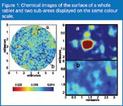 Once a mathematical model is in place, averaged compositional analysis by conventional spectroscopy is a simple, cost-effective method. Data acquisition is rapid and easy, with any operator able to generate results; productivity is in the order of thousands of samples per day. Usually an entire tablet is analysed, but if the edges and centre are compositionally identical, then a proportion of the tablet may be sufficiently representative. Table 1 gives a concentration distribution for a tablet based on (a) whole tablet image and (b) two smaller portions of the same tablet. Figure 1 shows the chemical images of the three areas. Together, these underline the importance of selecting a sampling method appropriate to the measurement objective when employing a bulk or averaged measurement technique.