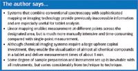 As with mapping, chemical imaging enables the accurate visualisation of almost all chemical compounds in the tablet, determining both the amount present and its location. However, chemical imaging collects thousands of spectra simultaneously from an entire field-of-view, without moving the sample, reducing measurement times to about 1 min. Focusing on a few key wavelengths cuts these further to just seconds, which means hundreds of samples can be measured in a single day. In general, camera-based imaging systems deal well with raw samples, such as whole tablets, granules and transdermal patches, or even whole blister packs, and analysis can be conducted through the packaging.