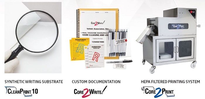 CleanPrint 10, is the synthetic, cellulose free, low particulate, writing substrate. It is extremely durable, yet pliable, while being resistant to abrasion, chemicals, and ink smearing. The Core2Print, is a 316L Stainless Steel HEPA filtered printing system. The Core2Print prints wirelessly onto VAI’s pre-sterilized CleanPrint 10 paper into the controlled area. Core2Write is a line of custom, customer specific, documentation featuring: logbooks, tags, forms, and labels. All Core2Write products are printed on CleanPrint 10 synthetic writing substrate. Core2Write products are available sterile, and quadruple bag packaged in VAI’s ABCD Cleanroom Introduction System.