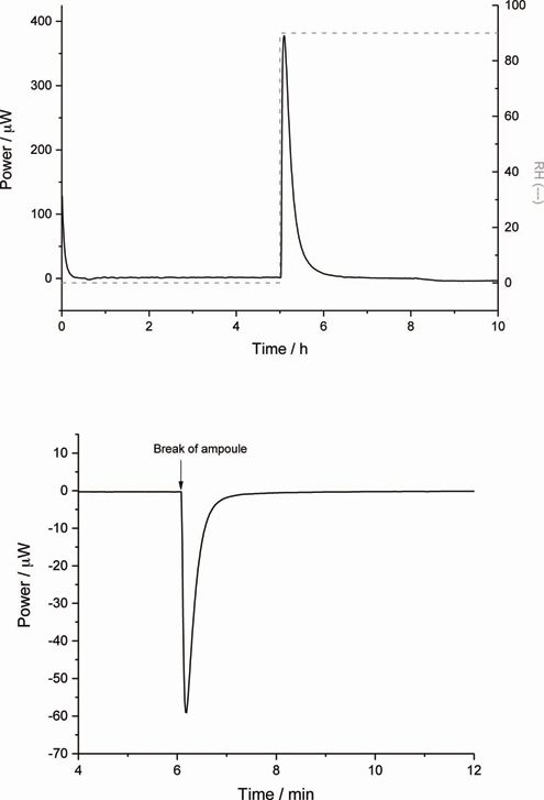 Solution (ampoule-breaking) calorimetry. In this method, the sample is contained within a sealed ampoule and a reservoir of solvent (up to 100 mL) is allowed to reach thermal equilibrium. The ampoule is then broken and the powdered sample is exposed to the solvent. Rapid dissolution should ensue, and the heat of solution is measured (5). The technique is particularly suited to amorphous content quantification because crystalline materials typically have an endothermic heat of solution while amorphous materials have an exothermic heat of solution. Typical power-time data for a partially amorphous material are shown in Figure 1.