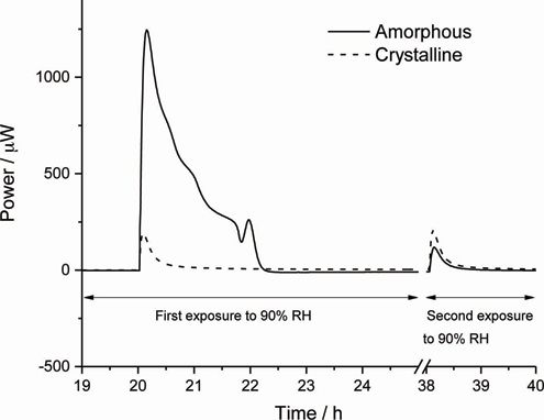 This approach not only provides the heat of adsorption, it also unequivocally demonstrates that the sample underwent an irreversible phase transition during the initial exposure to plasticizer (reaffirming the material was partially amorphous). Figure 2 shows the power-time data for amorphous and crystalline samples of salbutamol sulphate when exposed to two phases of elevated humidity (90%) (7). There are several important points to note: