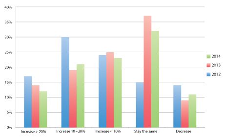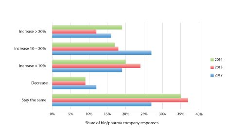 Customer expectations indicate that 2015 should be another good year for the contract services industry (Figure 7). One-third of bio/pharma company respondents expect their spending to increase by 10% in 2015, the same percentage as in the 2013 survey. Only 11% expect spending to decrease while most anticipate spending to be the same or slightly higher in 2015.