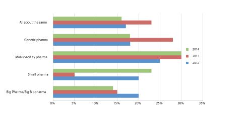 As in past years, contract service providers singled out mid-size and specialty bio/pharma companies as the main drivers of business success for this year (Figure 3), but there has been a big surge in the performance of small bio/pharma companies: 23% of contractor respondents identified small bio/pharma companies as their best-performing customer segment versus just 5% in 2013. This surge is consistent with what would be expected from the robust funding environment: smaller companies have been beneficiaries of improved venture capital and partnering funding, while mid-size and specialty companies benefit from improved public equity markets and partnering. The significance of generic-drug companies declined: only 18% of CDMO respondents identified them as their best performers, versus 28% last year.