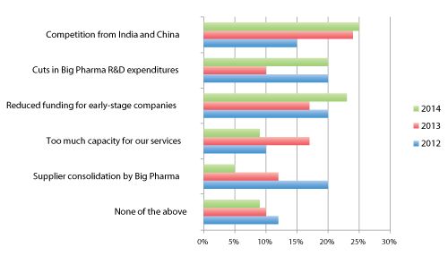Interestingly, while bio/pharma companies say they are less interested in sourcing from India and China, service providers still see that as the biggest risk to their business (Figure 5). Their concern about continued funding for development activities, however, has drawn almost even with the India/China concern: 20% identified cuts in spending at global bio/pharma companies as the biggest risk to their business, double the number in 2013, while 23% focused on the risk of reduced funding for early-stage companies. Clearly, the service provider respondents understand that the external financing environment and global bio/pharma’s need for new products are driving their success.