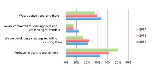 For service providers, the risk of losing clients as bio/pharma companies consolidate their supplier base remains high: 43% of bio/pharma respondents said they have reduced or plan to reduce the number of vendors they work with, the same as 2013. Interest in working with CMOs and CDMOs in India and China, in particular, continues to decline. Fifty percent of bio/pharma company respondents indicated they have no plans to source from those countries, up from 41% in 2013 and 33% in 2012 (Figure 4).