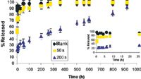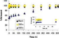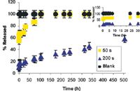 Scientists have adopted two general strategies to control drug release rate from porous materials. The first strategy relies on the adjustment of pore diameter and pore depth to control drug loading and release (4). The second uses surface functionalization of the pores, which affects drug affinity, and consequently release kinetics (4). However, these strategies have drawbacks. For example, in both strategies, the release kinetics are marked with an initial burst that may not be desirable in some applications. In addition, reducing the pore diameter to extend the length of drug release leads to a reduced pore volume and, consequently, less drug can be stored (6, 7). This article introduces a novel strategy for controlling the release of therapeutics from porous materials and demonstrates its applicability using model antibiotics and a protein.
