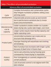 Table 1: The effects of uncontrolled nucleation.A number of techniques for controlling nucleation have been previously described, including the ice fog technique and ultrasound.(1,2) One technique that could offer potential for controlling nucleation is a technology developed by Praxair Inc (ControLyo) that enables ‘nucleation on-demand’. The technique involves cooling vials to a temperature at which nucleation can occur and then pressurising the system with nitrogen or argon gas. The freeze dryer is then rapidly de-pressurized and all vials nucleate simultaneously. The benefits include reduced cycle times, improved homogeneity of product, less damage from freezing, reduced vial breakage and an overall process that is generally more in conformity with quality by design initiatives. In addition, the technology is repeatable, scalable and has a large body of documented experimental data to validate its efficacy and benefits.(3)