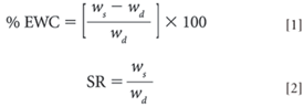 Absorbing water is one of the vital properties of hydrogels, because it makes them biocompatible (1). The water-absorbing capacity of hydrogels was determined in terms of percent equilibrium water content (% EWC) or swelling ratio (SR). The dry hydrogels were weighed (Wd) and then immersed in distilled water for 24 h at 37 ± 2 °C. The hydrogels then were reweighed (Ws) after removing the excess water by lightly soaking the swollen hydrogels using filter paper. The swelling ratio of the hydrogels was determined using the formula: