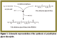 Synthesis of PEG-diacrylates. The cross-linker, PEGDA, was synthesized in the laboratory by the esterification reaction between PEG and acrylic acid monomer in dichloromethane. The esterification reaction is catalyzed by the addition of dicyclohexyl carbodiimide in the reaction mixture. The schematic representation of this reaction is shown in Figure 1.