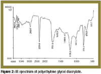 IR spectroscopy was performed to confirm the formation of an ester linkage between PEG and acrylic acid. The IR spectra of the reactants (acrylic acid and PEG) and the product (PEGDA) were compared for any change in vital peaks. The samples were compressed with potassium bromide in the form of pellets and analyzed using a Fourier transform IR spectrophotometer (PE 1600, Perkin Elmer, Waltham, MA).