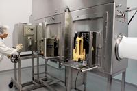 In addition to the standardization of the docking locations, each piece of processing equipment had to penetrate each standardized plate in a manner that placed the processing surfaces in an ergonomically viable space within the isolator. Once the required equipment was installed, the plates formed the rear wall of the isolator. The isolator was then sealed and negatively pressurized. Each was also fitted with a variety of utilities inside including electric, water, compressed air, and vacuum.