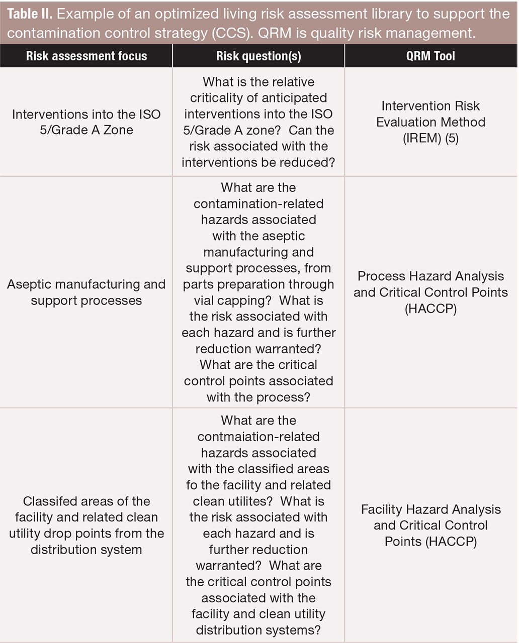 Table II. Example of an optimized living risk assessment library to support the contamination control strategy (CCS). QRM is quality risk management. FIGURE IS COURTESY OF THE AUTHORS.