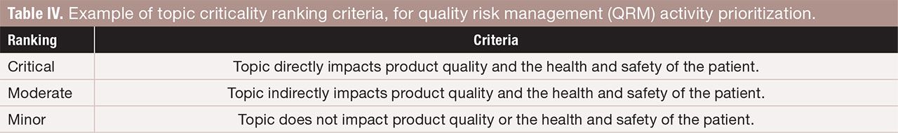 Table IV. Example of topic criticality ranking criteria, for quality risk management (QRM) activity prioritization. FIGURE IS COURTESY OF THE AUTHORS.