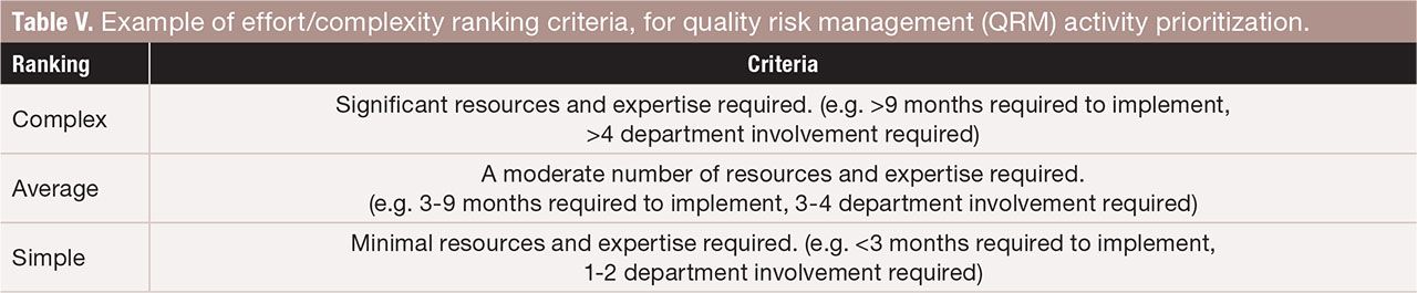Table V. Example of effort/complexity ranking criteria, for quality risk management (QRM) activity prioritization. FIGURE IS COURTESY OF THE AUTHORS.