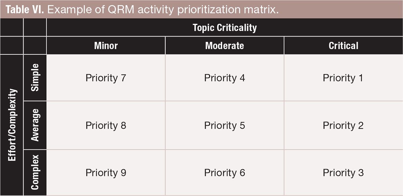 Table VI. Example of QRM activity prioritization matrix. FIGURE IS COURTESY OF THE AUTHORS.