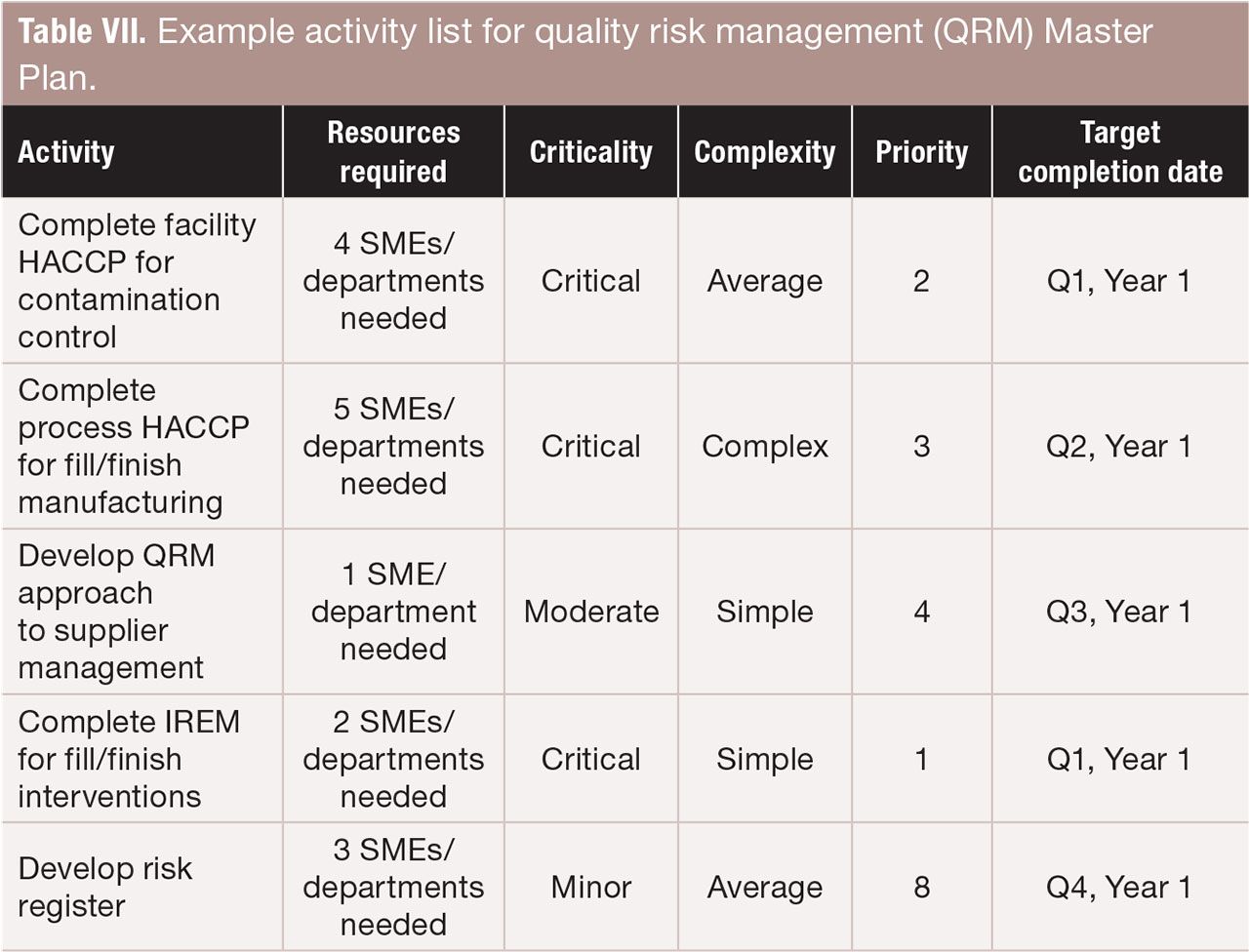 Table VII. Example activity list for quality risk management (QRM) Master Plan. FIGURE IS COURTESY OF THE AUTHORS.