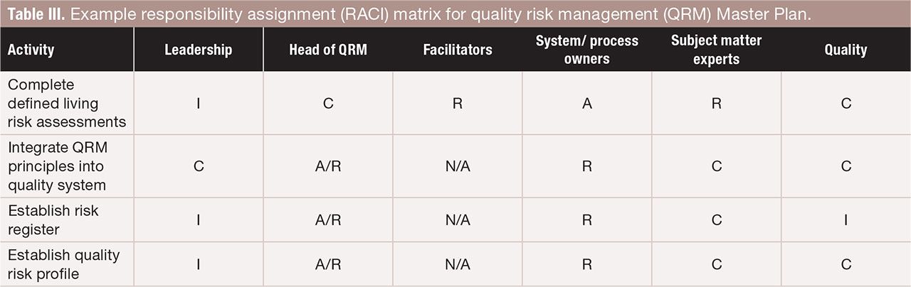 Table III. Example responsibility assignment (RACI) matrix for quality risk management (QRM) Master Plan. FIGURE IS COURTESY OF THE AUTHORS.