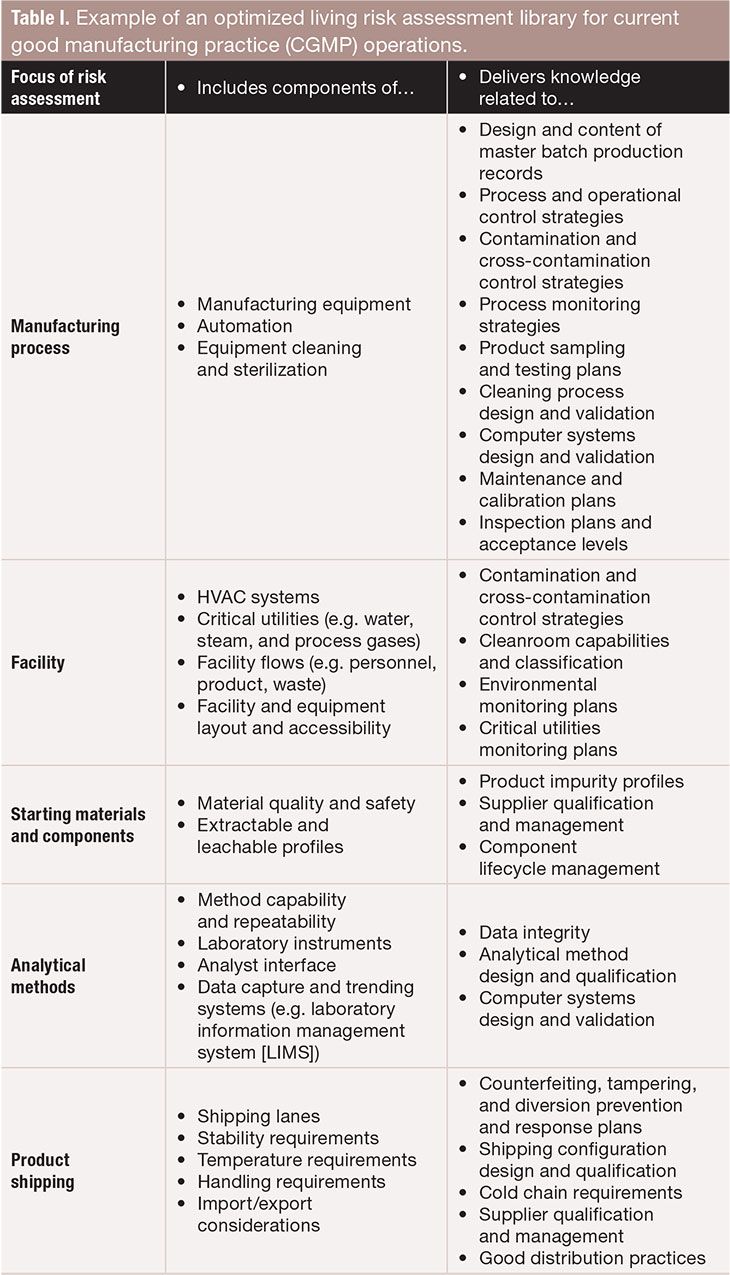 Table I. Example of an optimized living risk assessment library for current good manufacturing practice (CGMP) operations. FIGURE IS COURTESY OF THE AUTHORS.